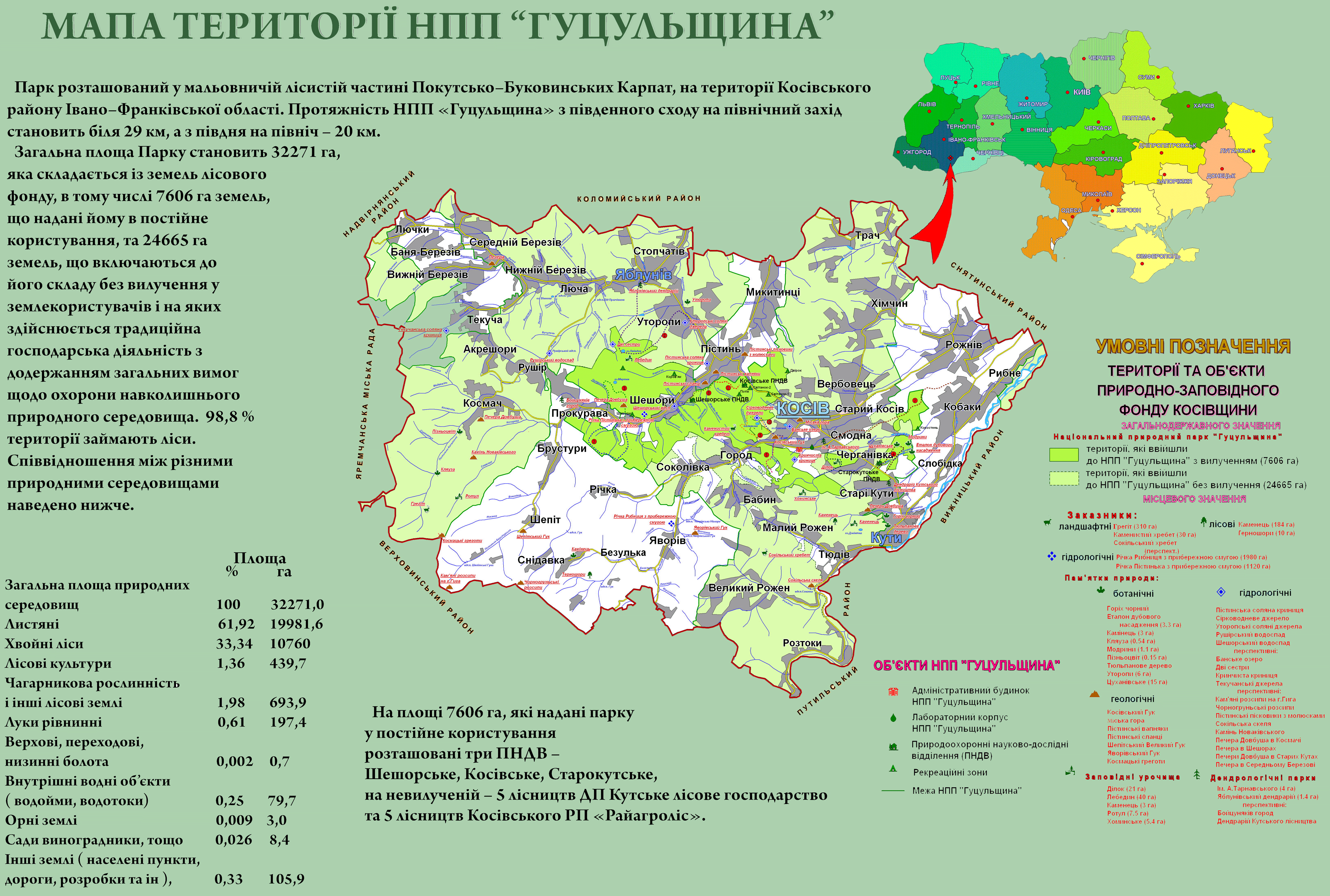 Власне, задля збереження відтворення та раціонального використання генетичних ресурсів рослинного і тваринного світу, унікальних природних комплексів та етнокультурного середовища, які мають особливу природоохоронну, оздоровчу, історичну, наукову, пізнавальну, освітньо-виховну, естетичну та рекреаційну цінність і був створений Національний природний парк «Гуцульщина» (Указ Президента України від 14 травня 2002 року). Парк розташований у межах Косівського району Івано-Франківської області й охоплює площу 32248 га, із них 7581 га земель надані Парку в постійне користування, а 24667 га включені до його складу без вилучення у землекористувачів. Протяжність Парку з північного заходу на південний схід близько 29 км, а з північного сходу на південний захід – 20 км.