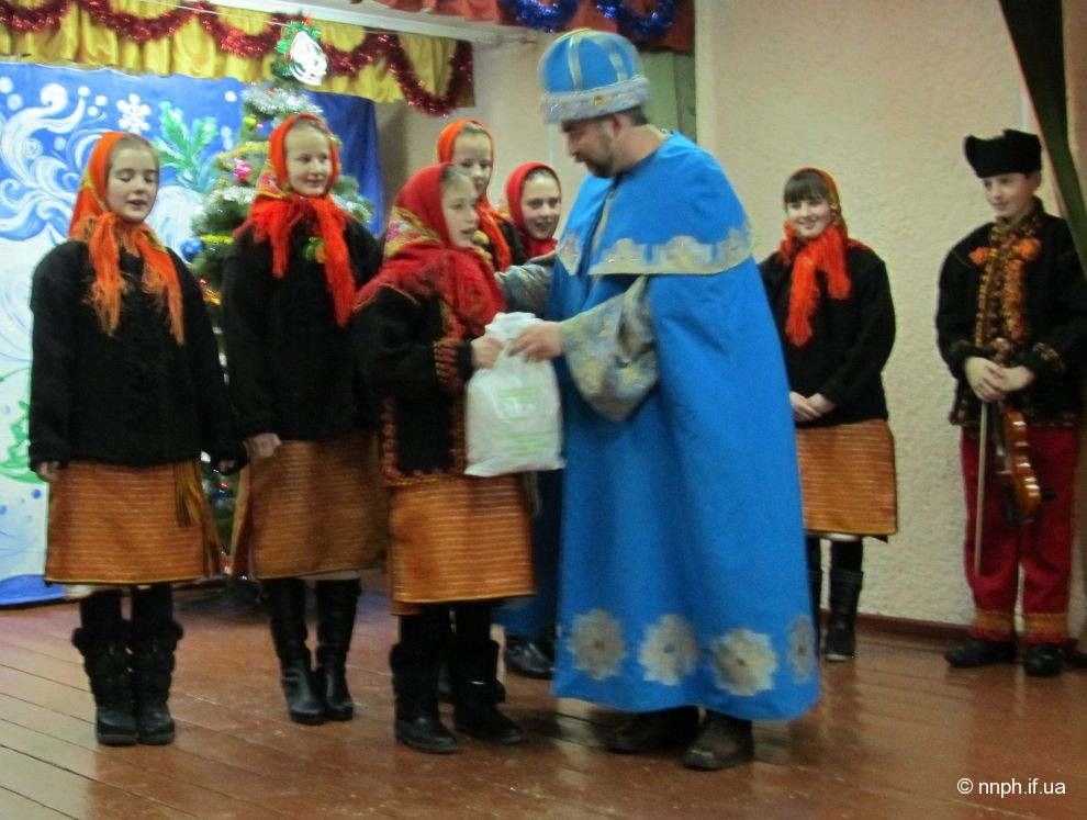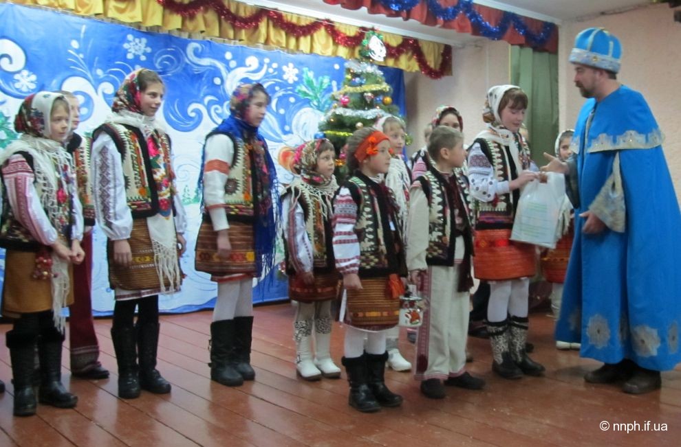 Вже не один рік поспіль на свято “Коляди” прибуває Святий Миколай із свого Маєтку, що знаходиться на території національного природного парку “Гуцульщина”. Щораз він приходить до дітей з добрим словом та подарунками. І цього разу Миколай щиро вітав всіх учасників та гостей чудового фольклорного свята, бажав кожному гарного настрою, творчого натхнення, а найголовніше міцного здоров’я та цілий день вручав солодкі подарунки колядникам, які передали для дітей: Косівська РДА (голова Шинкарука Я. І.) і Київський міський благодійний фонд “Фудбенк” (голова Іванов В. В.).